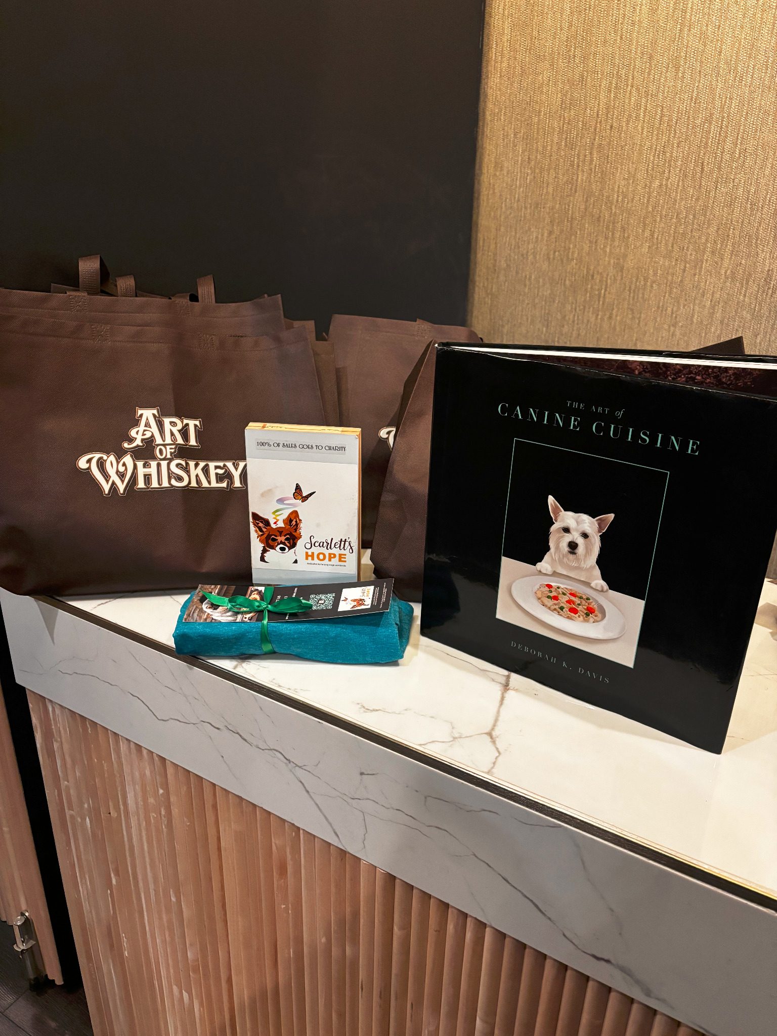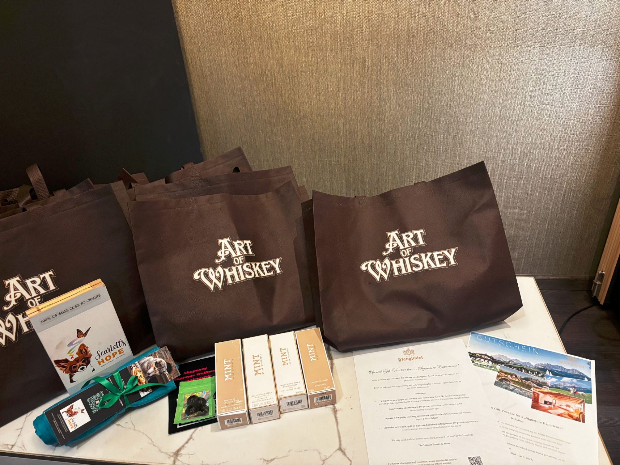 Each guest received a premium Art of Whiskey gift bag featuring thoughtfully selected luxury, wellness, and charitable offerings. Gifting included wellness gummies contributed by Shapenvy Supreme Wellness Supplements by Jon Kodak. Scarlett's Hope, a nonprofit animal welfare initiative, contributed yoga-style T-shirts as well as access to purchase The Art of Canine Cuisine, a luxury dog cuisine cookbook by Deborah Davis featuring healthy, at-home recipes for pets, with proceeds supporting the charity's mission. Celebrity Stylist Ivan Montero contributed a gift card to his shop and services in Los Angeles.
