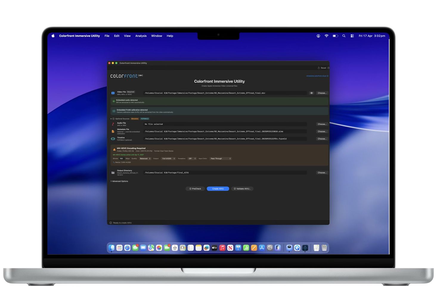 LOS ANGELES - Californer -- Colorfront today announced Colorfront Immersive Utility, a new macOS app that creates Apple Immersive Video files (.aivu) for playback on Apple Vision Pro. The app accepts video in ProRes, MV-HEVC, and other standard formats, pairs it with Spatial Audio and camera metadata, and outputs a single AIVU file ready for distribution.