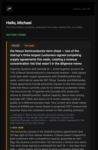 A venture partner receives a brief showing that two of a startup's largest customers just signed competing supply agreements — with a recommendation to pause the term sheet. A CEO preparing for an earnings call receives the three questions analysts are most likely to ask based on signals from the past 48 hours. A real estate broker receives a brief flagging a $140M infrastructure bond in a zip code where permits have tripled — and positions her team ahead of competing brokerages.