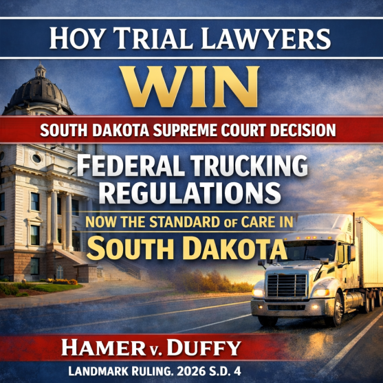 SIOUX FALLS, S.D. - Californer -- The South Dakota Supreme Court's February 4, 2026 decision in Hamer v. Duffy, 2026 S.D. 4, establishes that violations of Federal Motor Carrier Safety Regulations can constitute negligence per se under state law, reshaping how truck accident cases will be litigated and settled statewide. Hoy Law of Sioux Falls represented Justin and Kim Hamer and secured the landmark ruling.