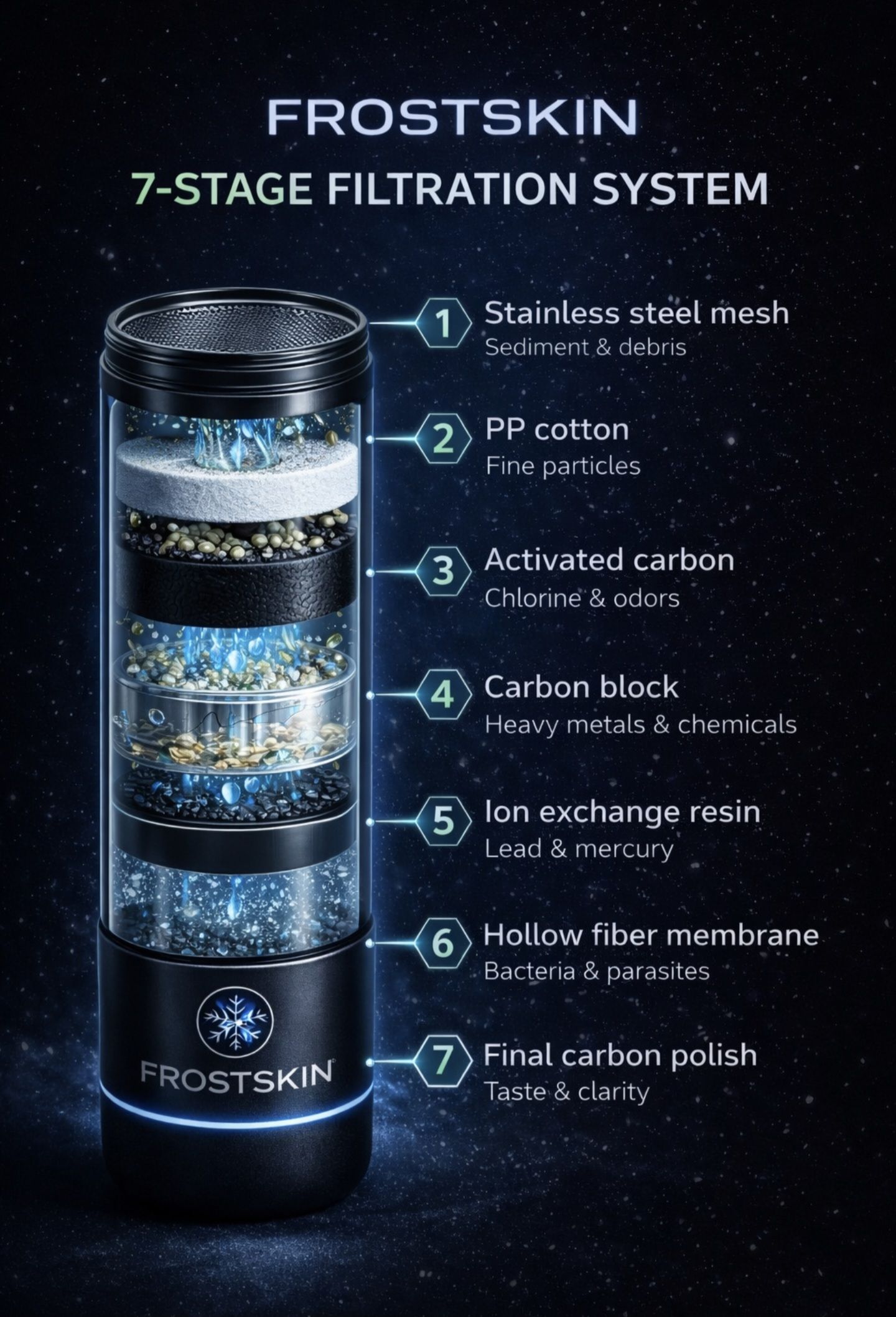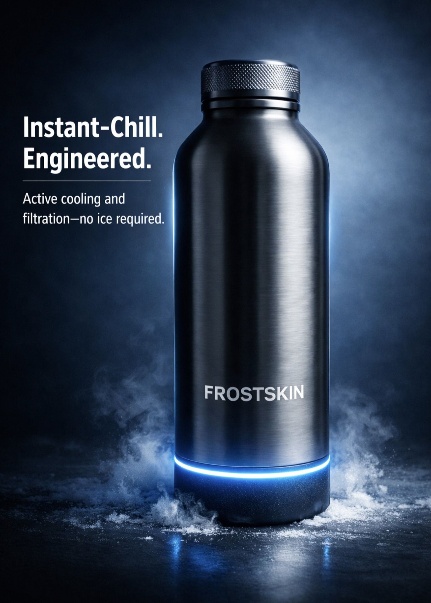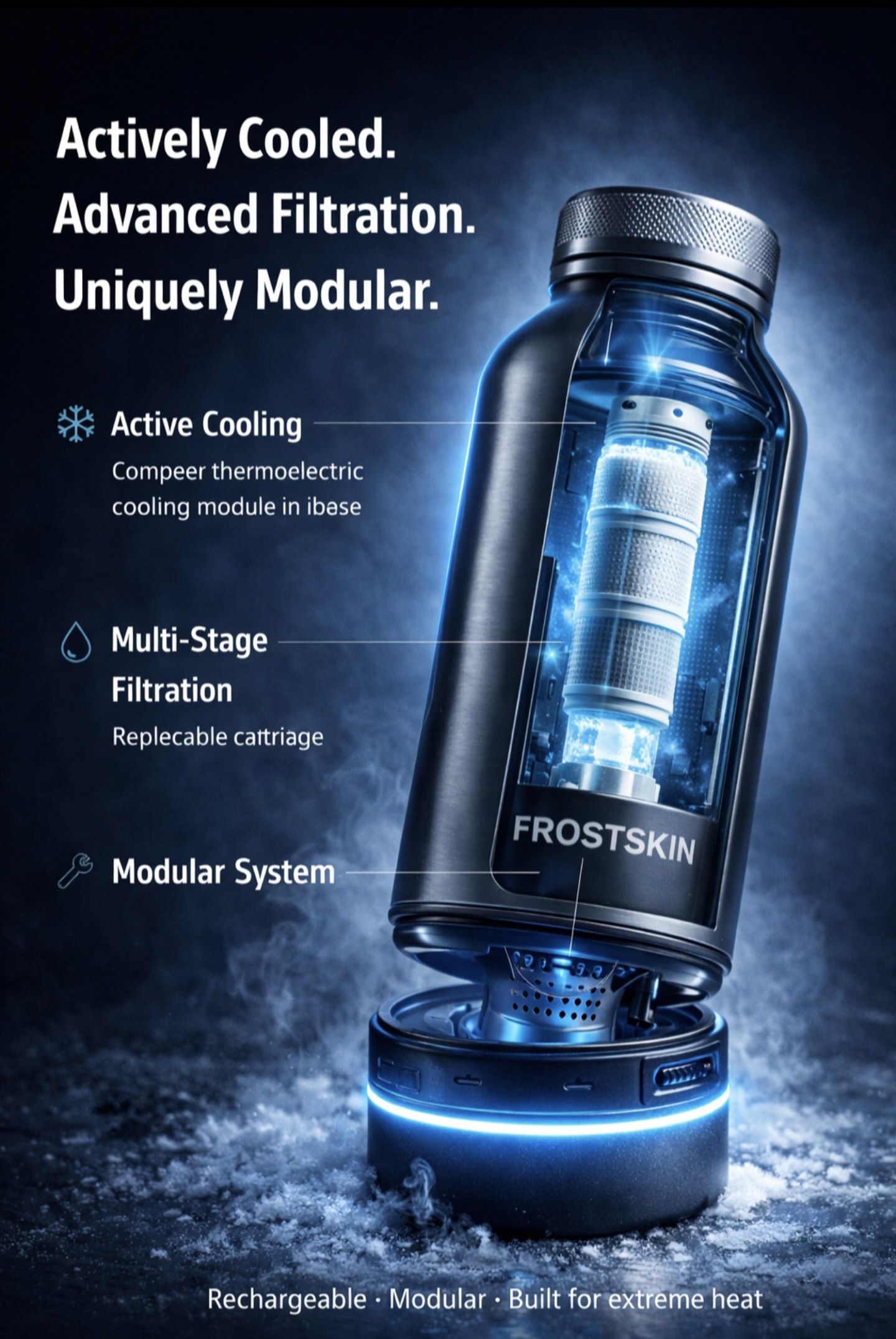 Unlike traditional insulated bottles that rely on ice or pre-chilled liquids, FrostSkin actively chills and purifies freshwater on demand — transforming ordinary tap or travel water into cold, clean drinking water in seconds.