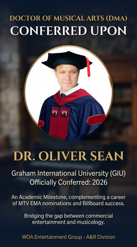 FARO, Portugal - Californer -- Independent music icon and filmmaker Oliver Sean Alvares, known professionally as Oliver Sean, has been officially conferred the degree of Doctor of Musical Arts (DMA) from Graham International University (GIU). This professional doctorate marks a defining academic milestone for the multiple Billboard Top 10 artist, following a multi-year period of advanced research and performance practice.