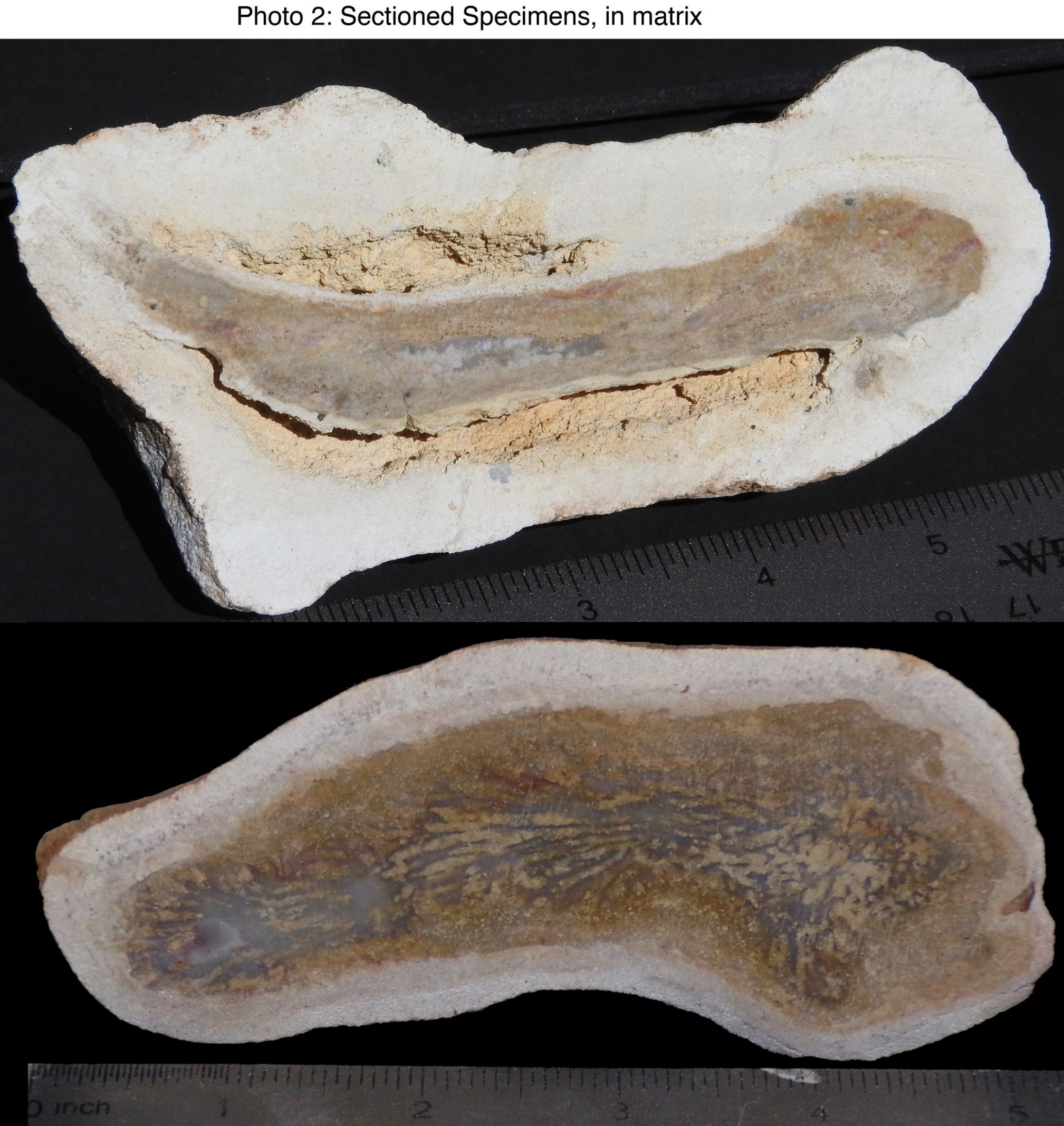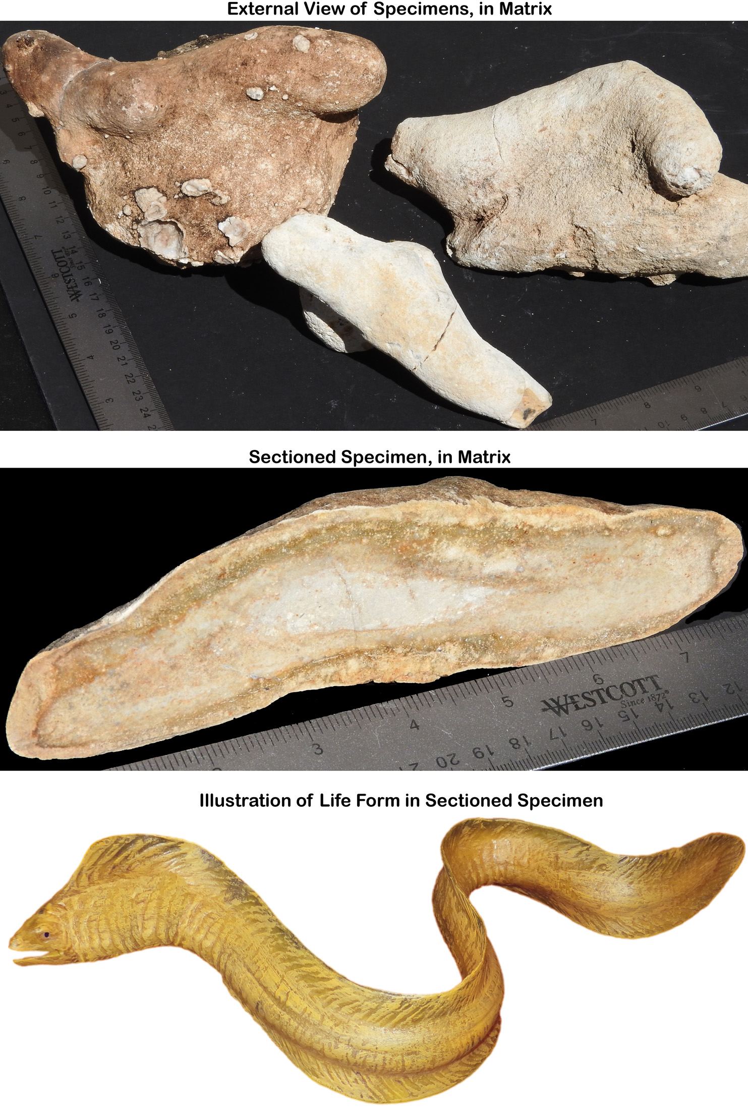 "Since nematodes were present during both the Cambrian and Permian explosions of life, our fossils provide a rare glimpse of how nematode DNA developed into boneless fish in both periods. When Calcium Secreting Filter Feeder (CSFF) DNA was integrated into these life forms, they went on to become boned fish. Boned fish like the lung fish are believed to be forerunners of terrestrial tetrapods, such as dinosaurs." Mr. Zamoyski added. "The second photo shows two such sectioned specimens, the first an early boneless fish likely of nematode origin and the second a similar fish/worm but with integrated CSFF DNA, providing a glimpse of how boned life forms arose."